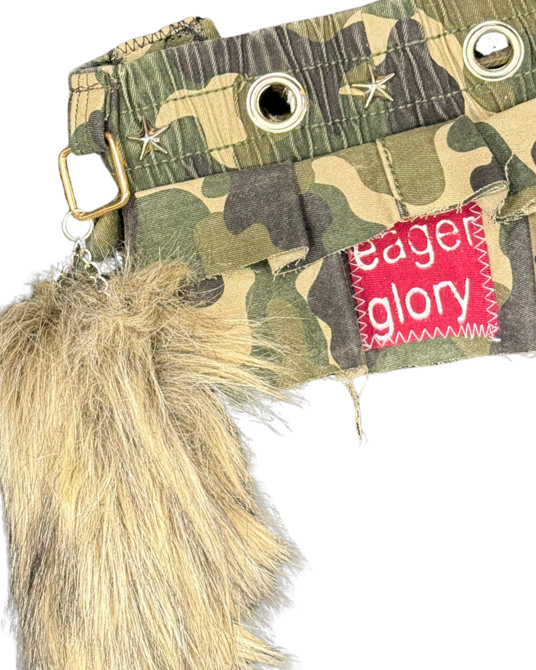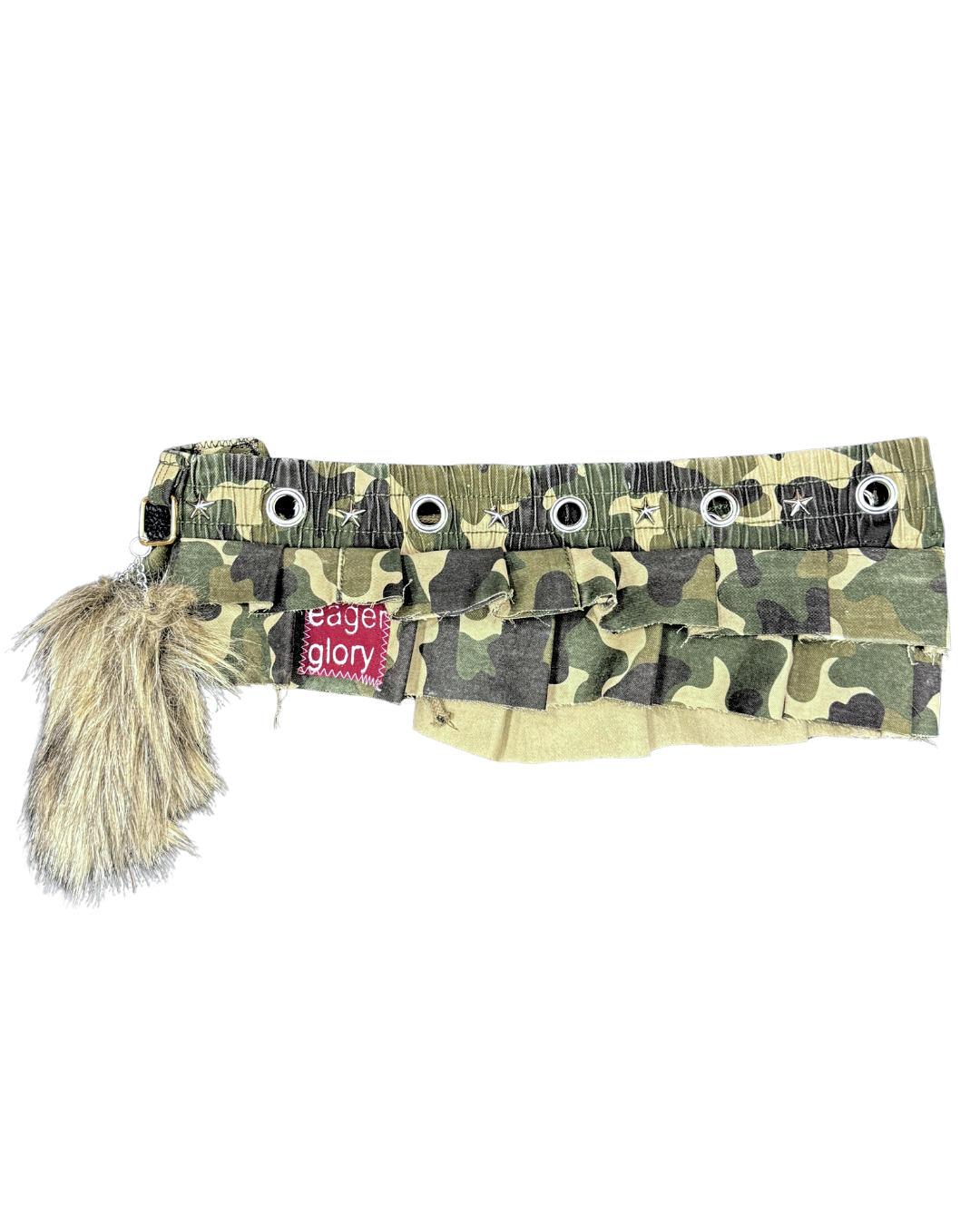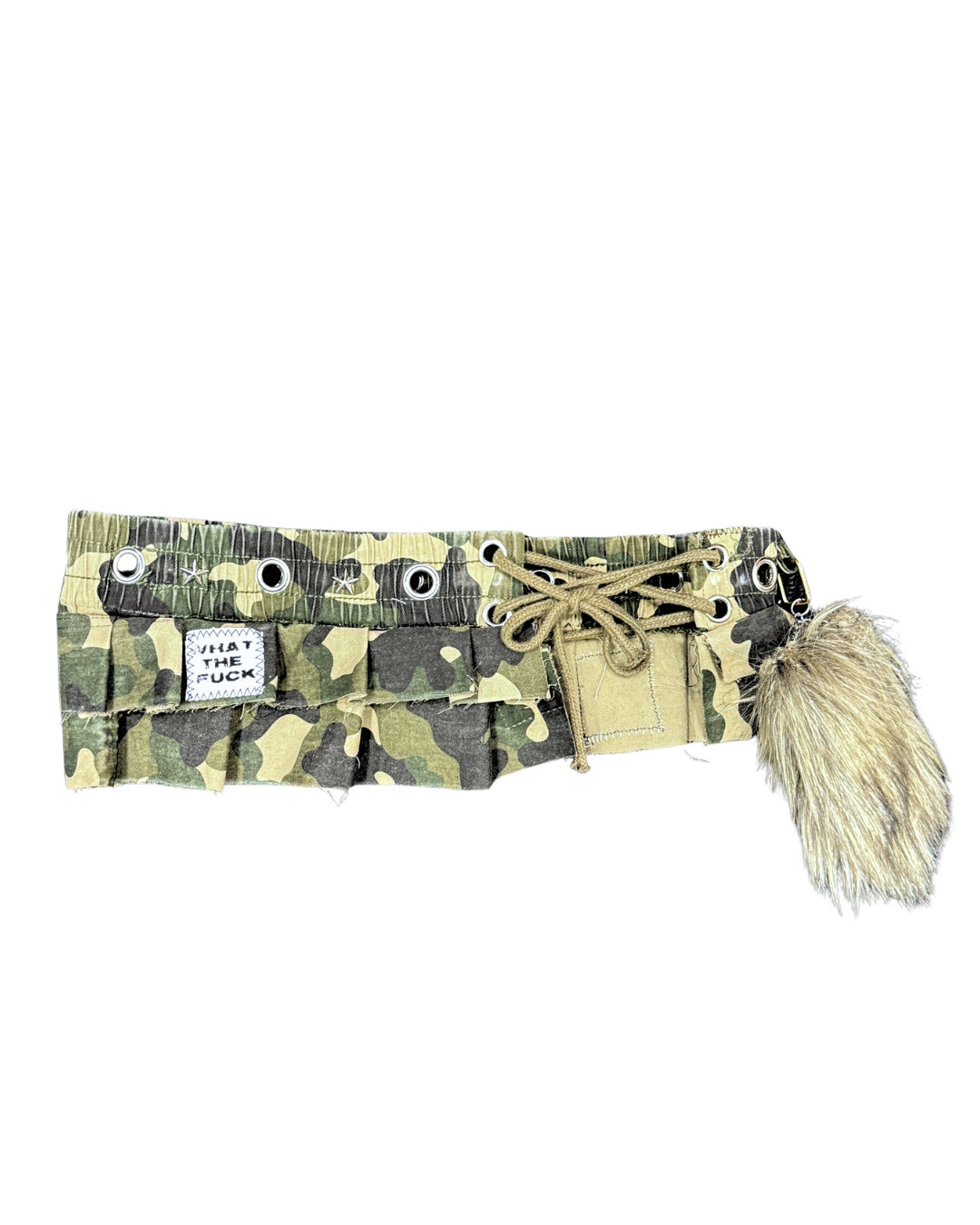 ✮ CAN'T SEE ME ✮ Sz M ✮ UPCYCLED Skirt/Belt made from camo pants and custom screenprinted patches material. Features a fur tail ✮